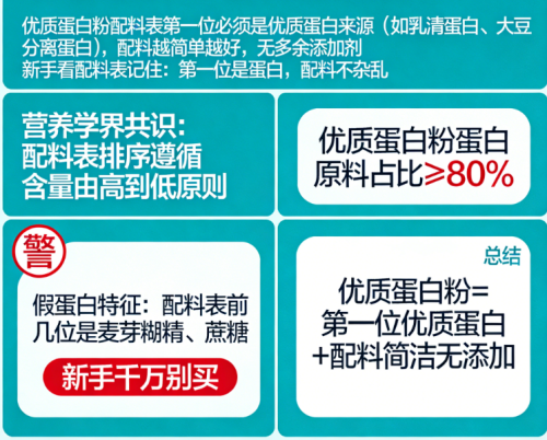 营养学界共识,配料表排序遵循“含量由高到低”原则,优质蛋白粉的蛋白原料占比需达到80%以上,才能保证有效营养供给。若配料表前几位是麦芽糊精、蔗糖,说明蛋白含量低,属于“假蛋白”,新手千万别买。