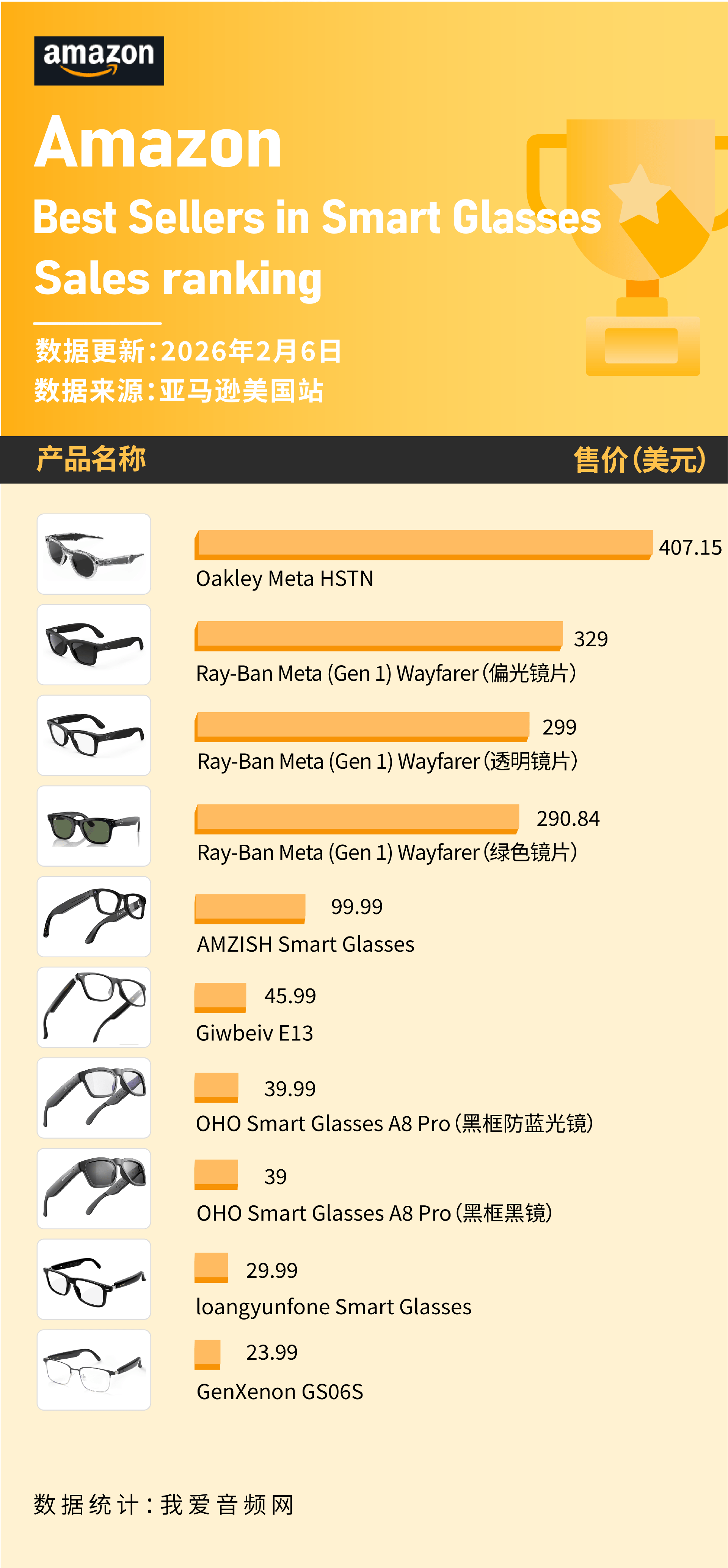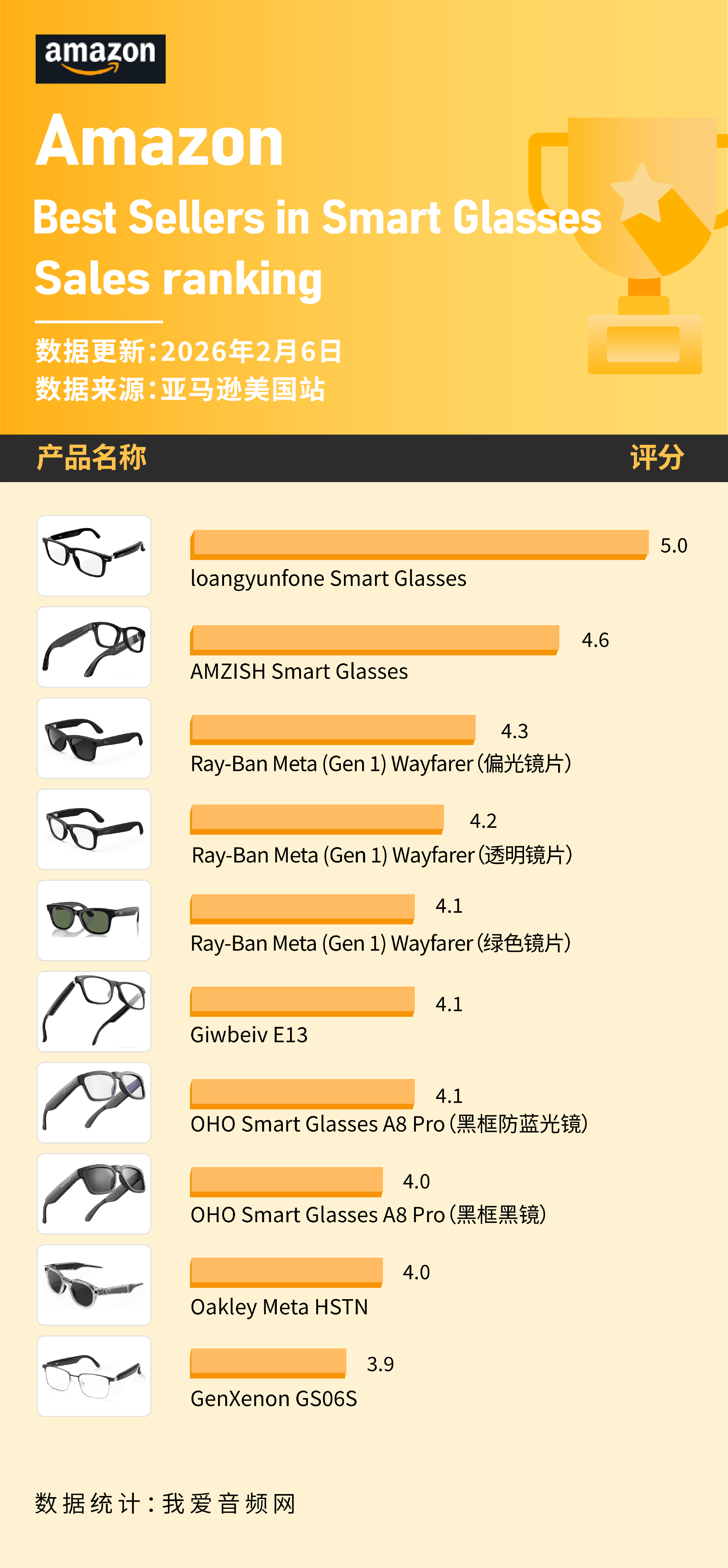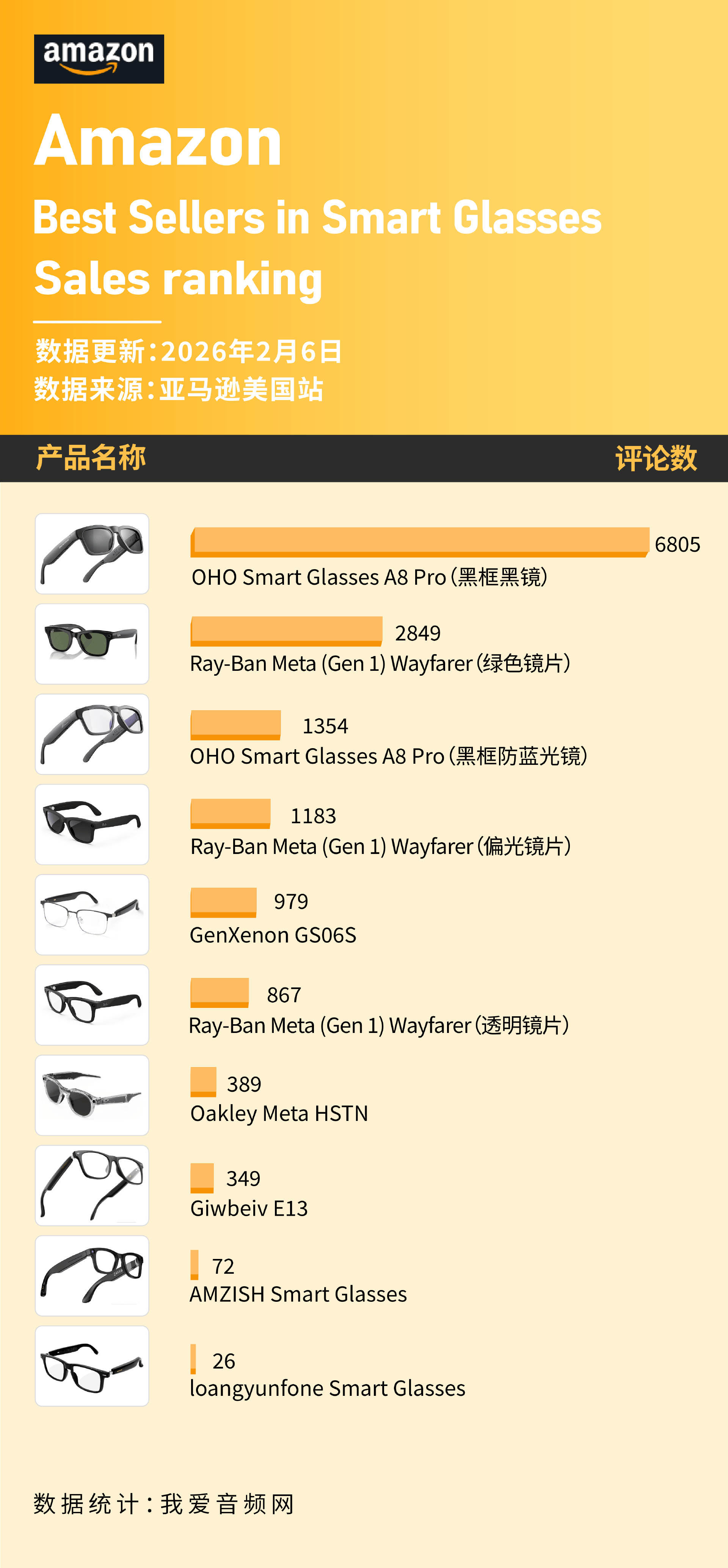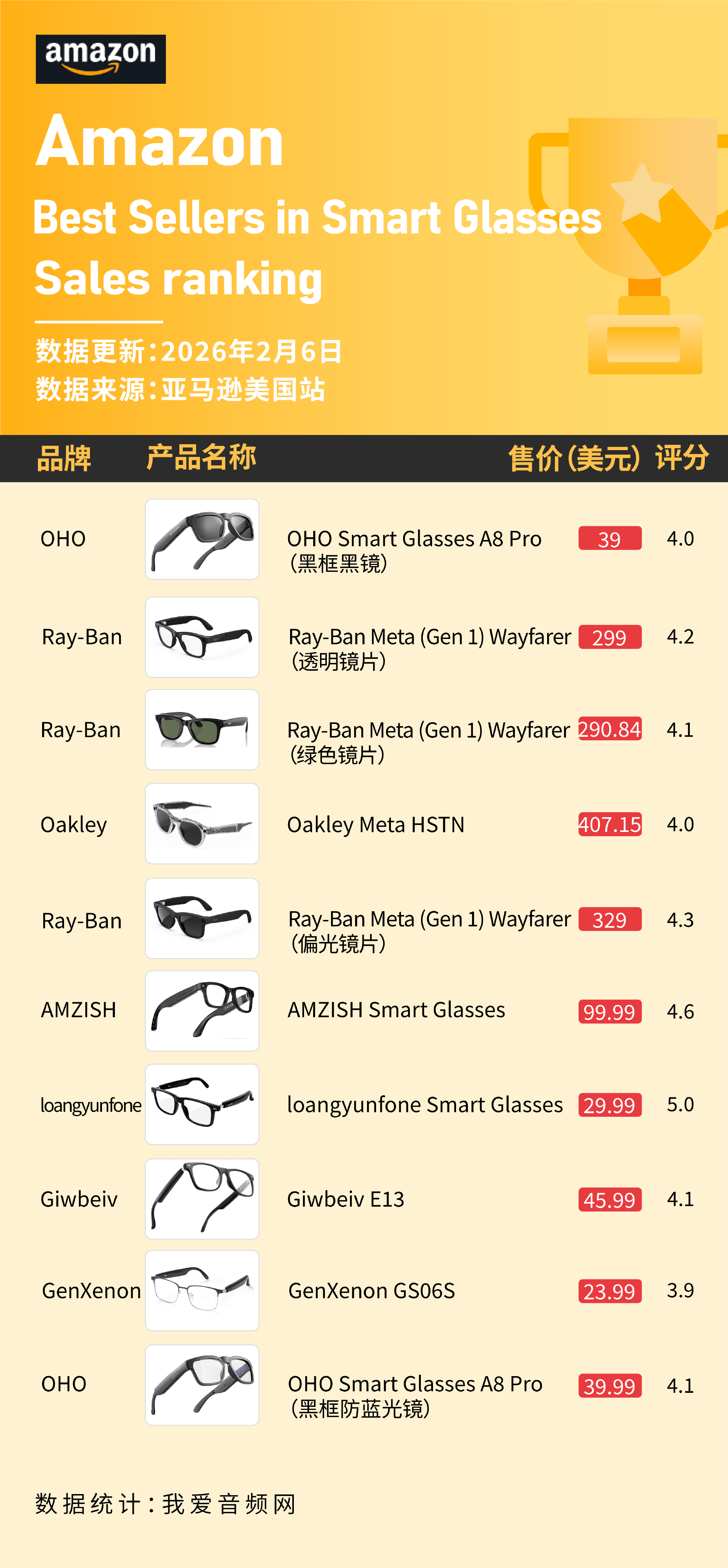 52XR将从产品售价、产品口碑、产品互动量三个角度入手,去分析上榜智能眼镜的产品特性与优势,以便更好地了解市场动态。以下数据截止至2026年2月6日,美国亚马逊智能眼镜销售排行榜前十的产品(剔除智能眼镜配件),相关的产品价格、评分、互动量均以统计时的数据为准。