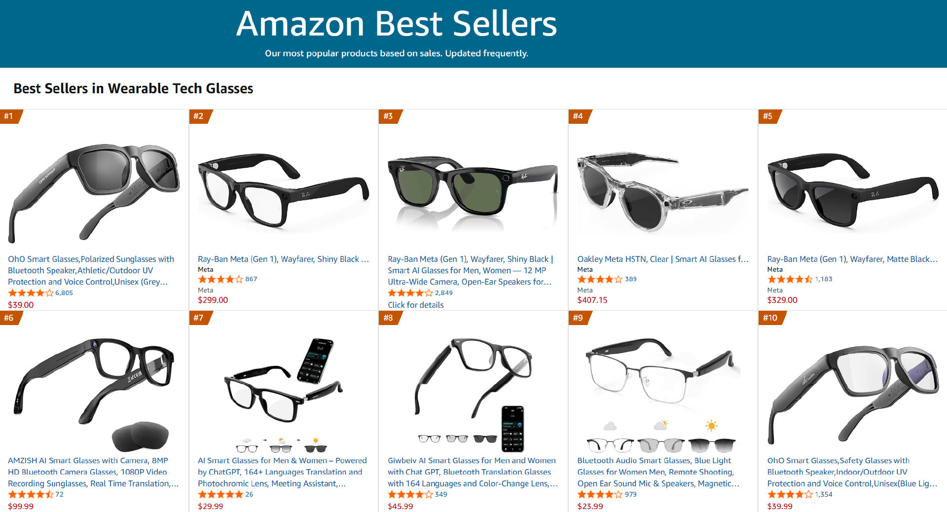 榜单中最贵的是Oakley Meta HSTN,售价407.15美元。Ray-Ban品牌上榜的3款产品售价都超过200美元,包揽榜二到榜四的位置。