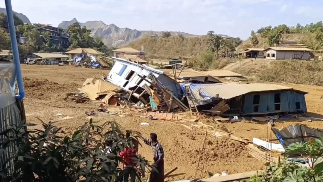 1月13日,在缅甸克钦邦帕甘镇,玉石矿区泥潭坍塌后流出淤泥导致民房被毁(视频截图)。